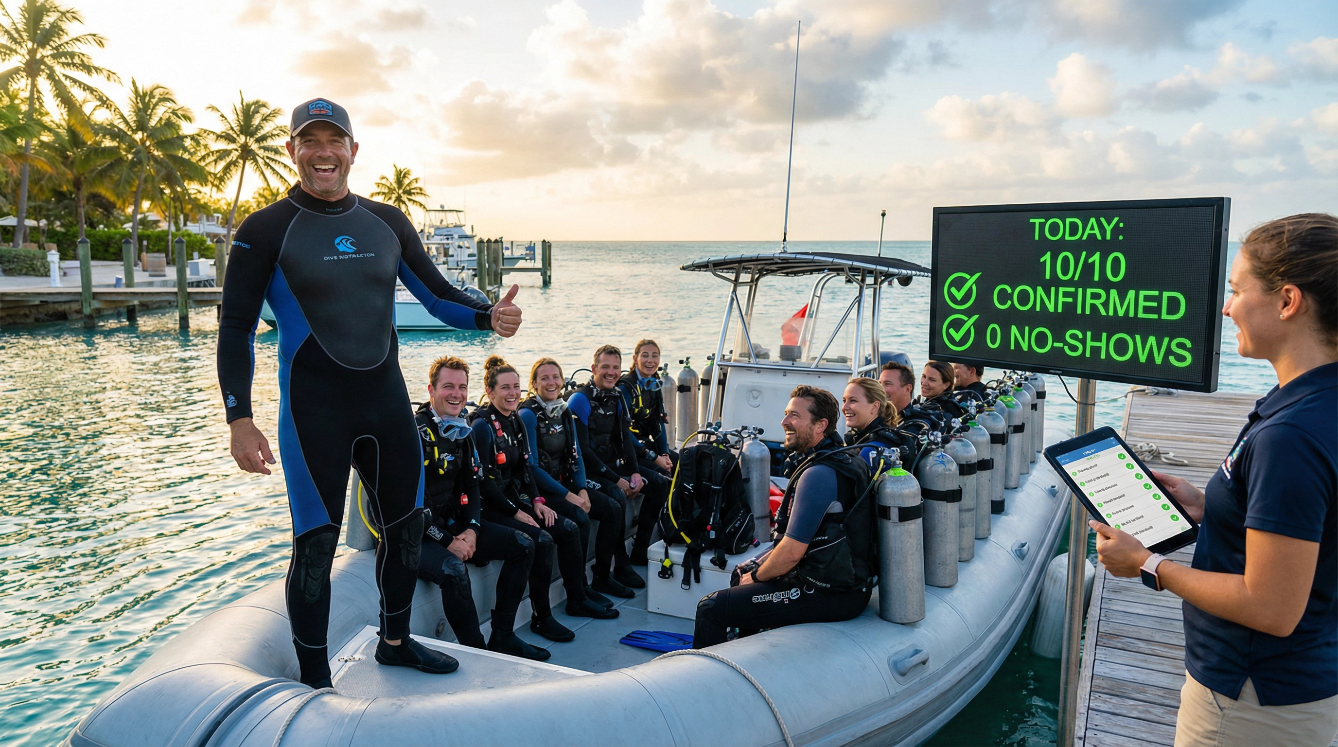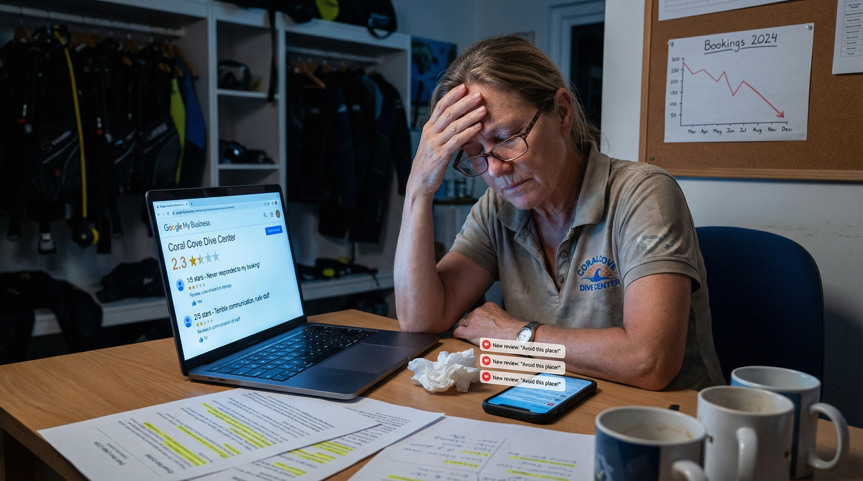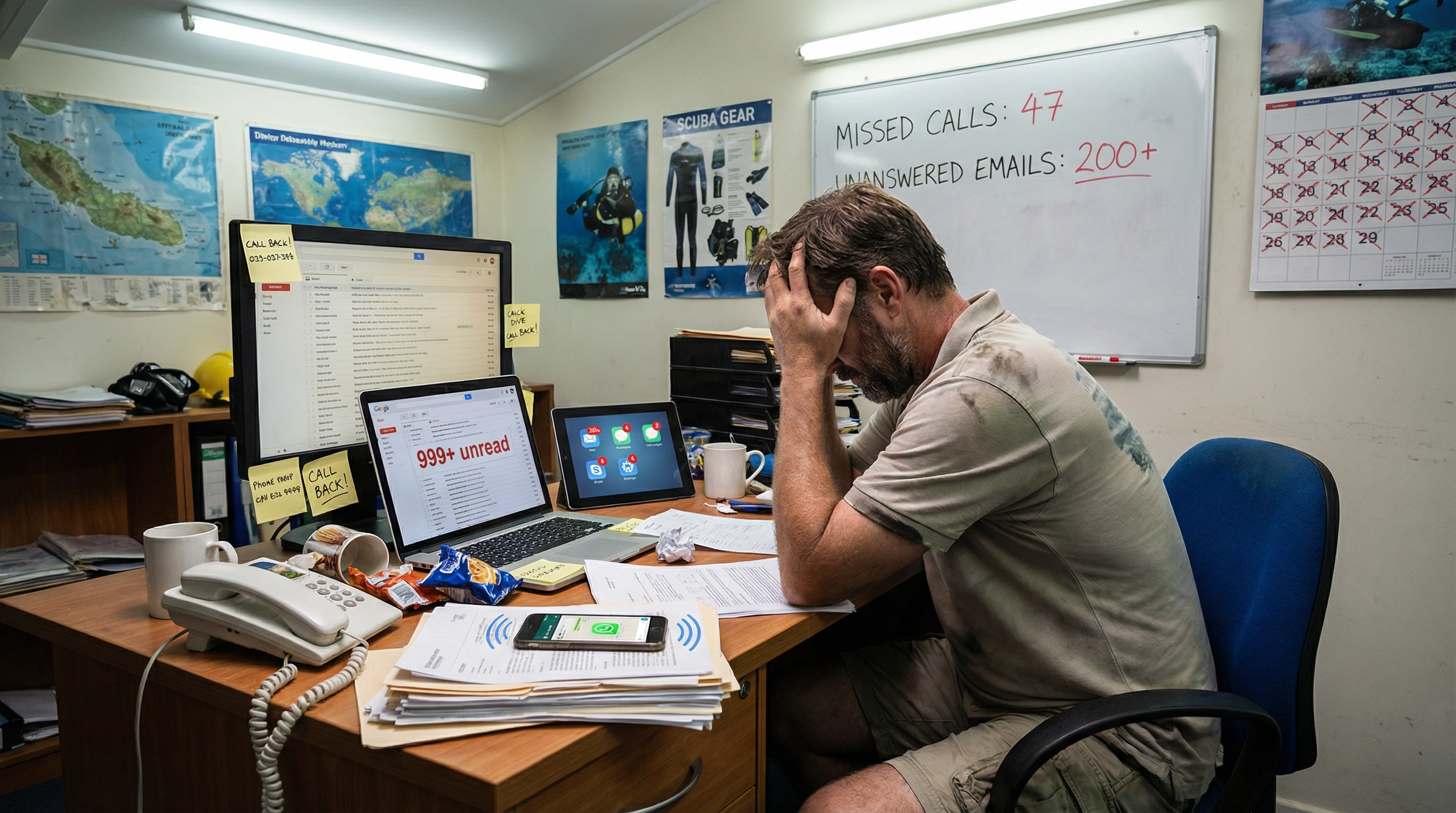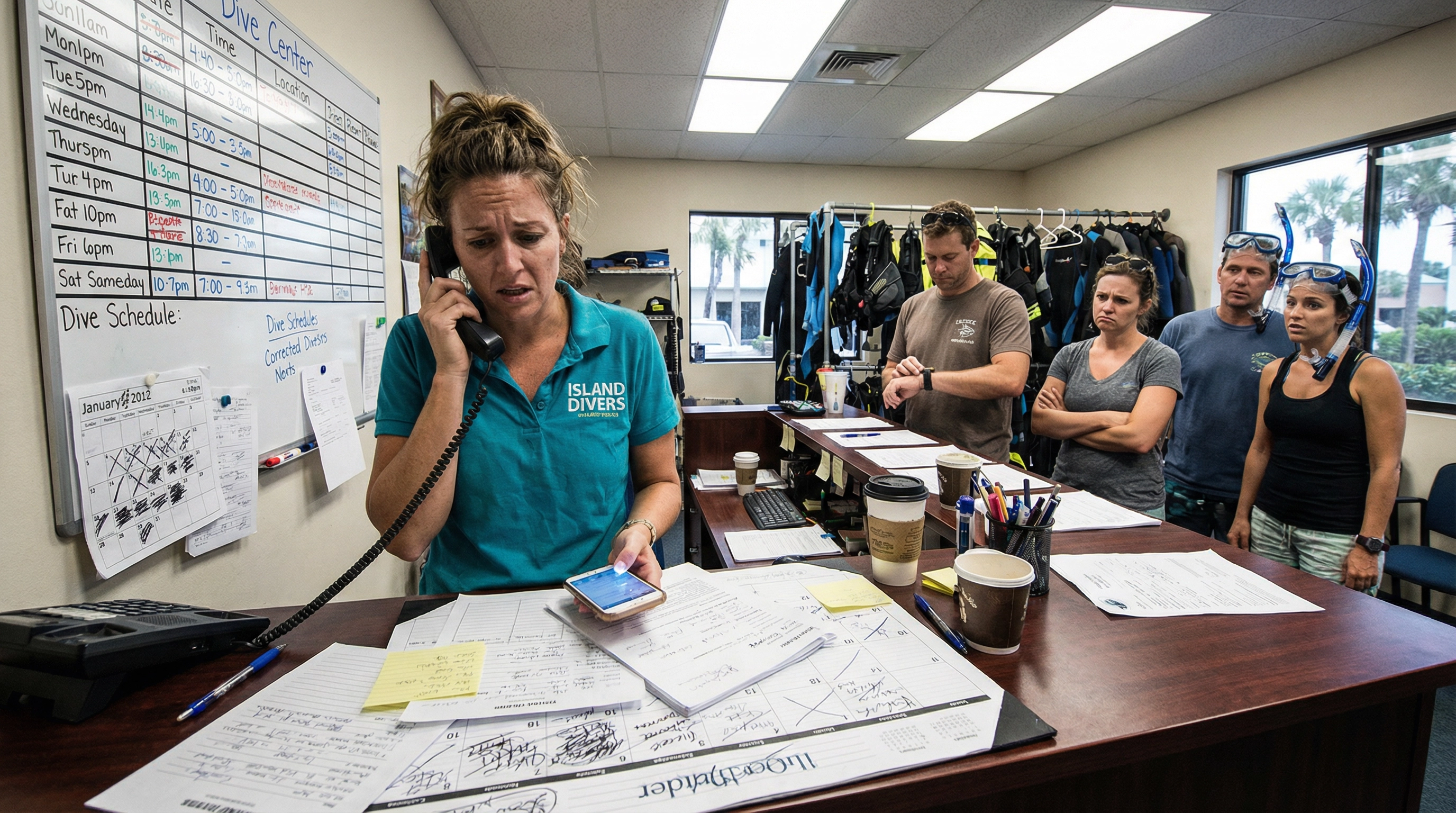 Hacer malabarismos con complejos horarios de buceo, requisitos previos para la certificación, disponibilidad de embarcaciones, cancelaciones por mal tiempo y llamadas telefónicas interminables. Cada llamada perdida supone una pérdida de ingresos de más de 200 dólares.