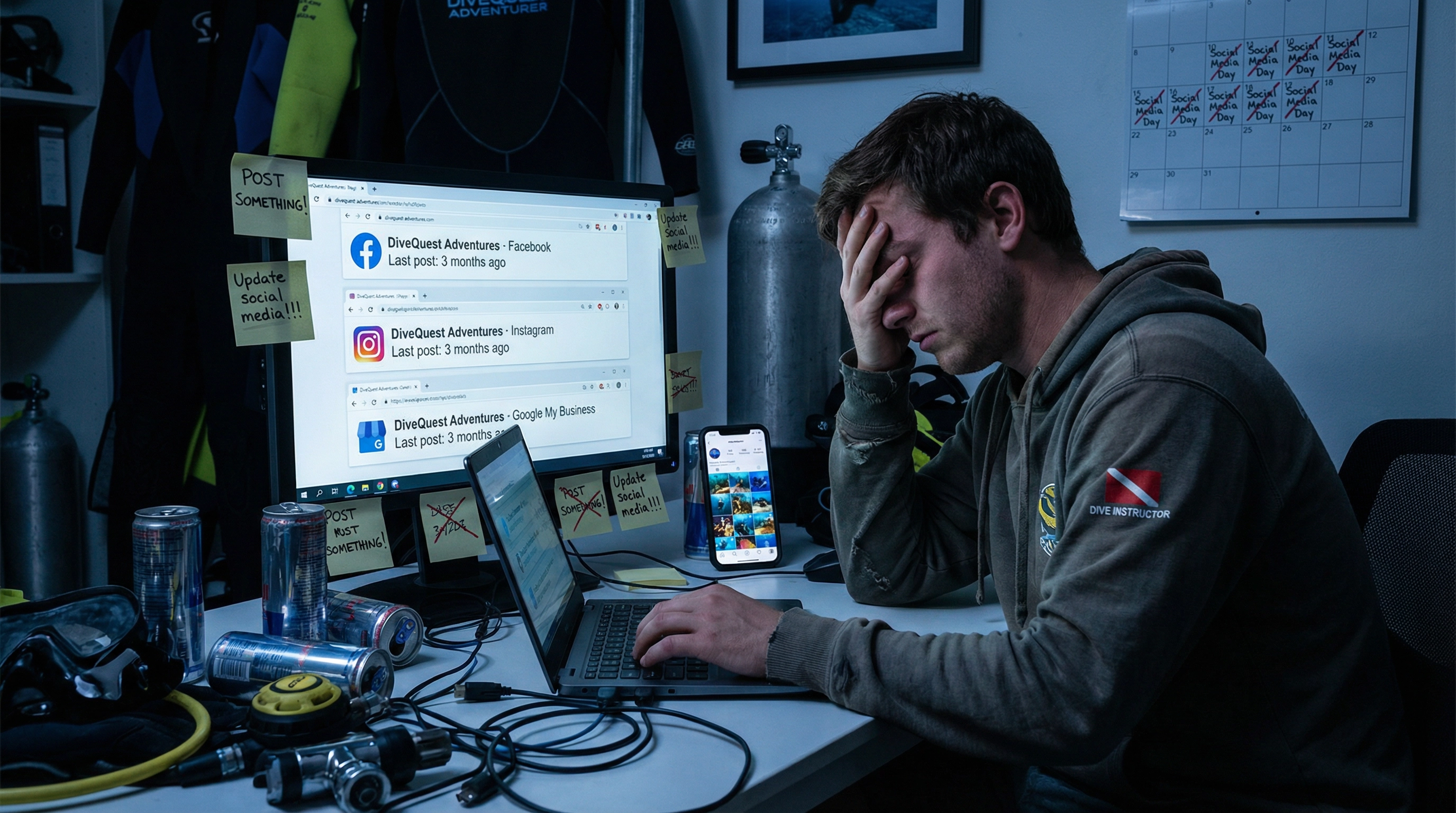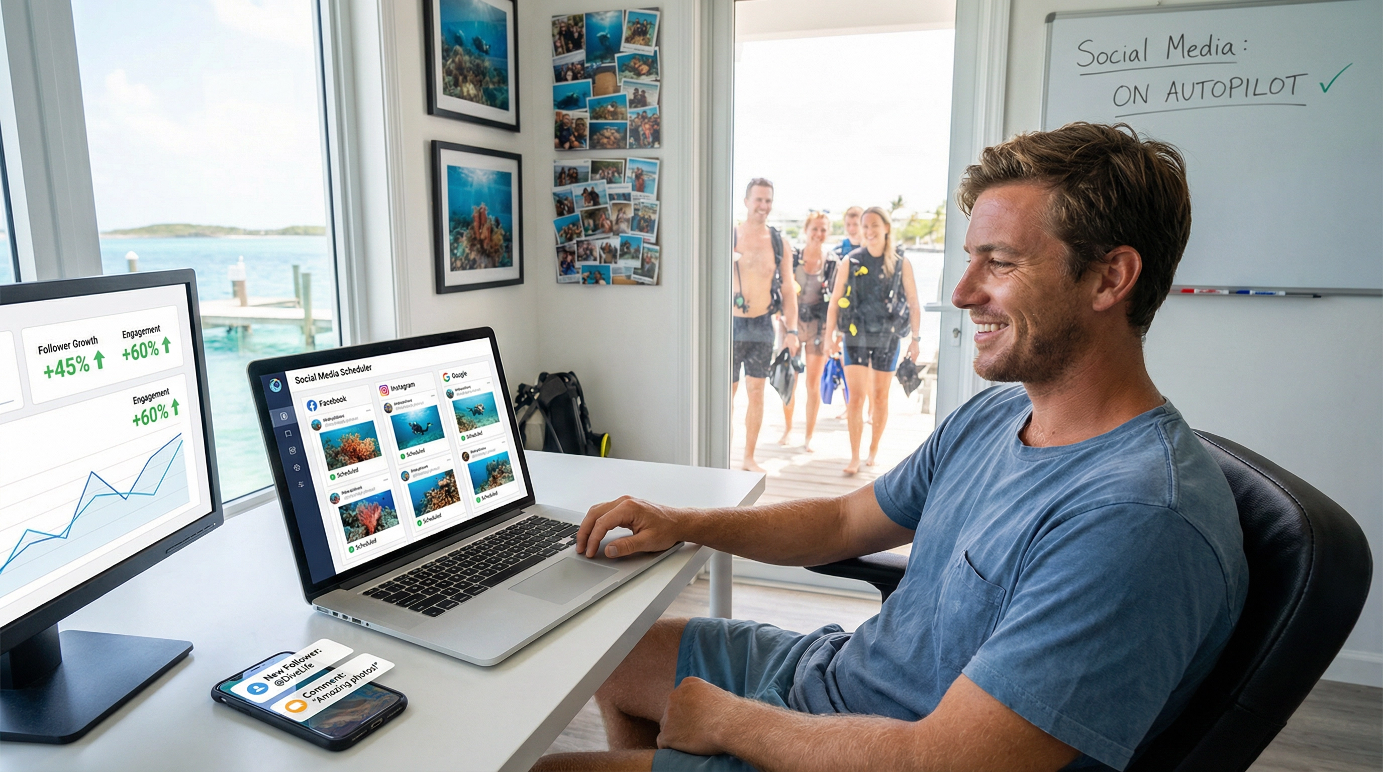 Te convertiste en profesional del buceo para compartir tu pasión por el océano, no para estar enterrado bajo hojas de cálculo, llamadas perdidas y dolores de cabeza relacionados con el marketing.